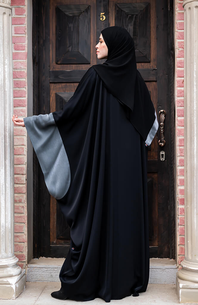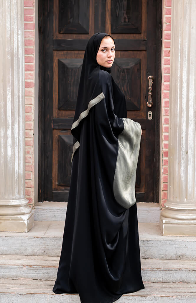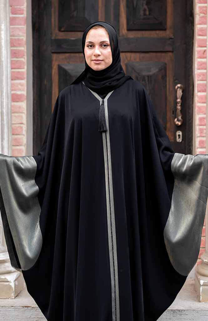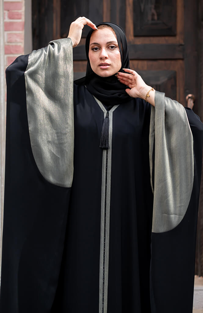 تتميز العباية أيضاً بتفاصيل أنيقة ومتقنة، حيث تحتوي على تطريز دقيق وجميل على الحواف أو بعض الزخارف على الصدر. يضفي هذا التصميم لمسة من التميز والأناقة على العباية، مما يجعلها قطعة فريدة من نوعها.
