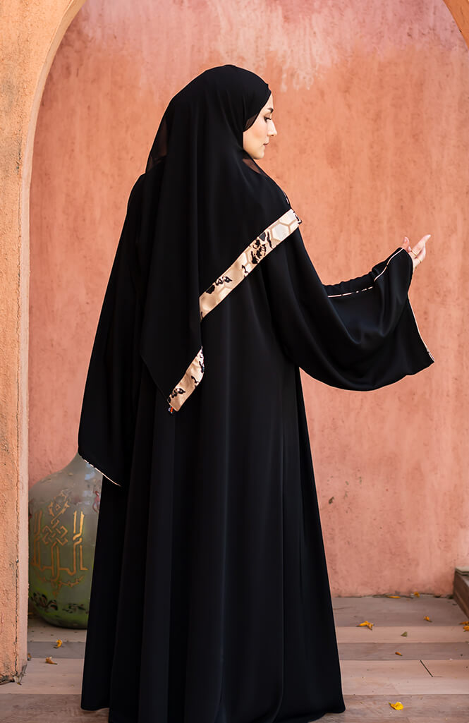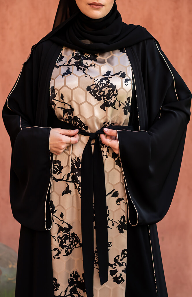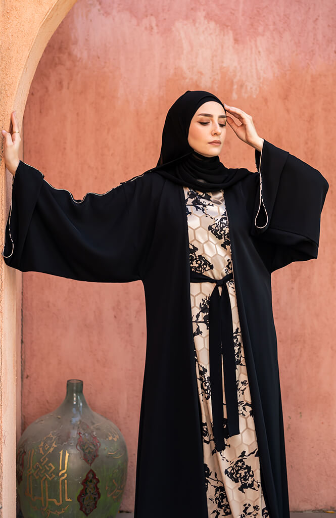 تمتاز هذه العباية السوداء بتصميم أنيق وأنثوي، مصنوعة من قماش عالي الجودة باللون الاسود مطعم باللون البيج من مصنع فيفر. تتميز بقصة مريحة واسعة توفر لك الراحة طوال اليوم مع إضافة لمسة أنيقة وعصرية إلى إطلالتك. تعتبر هذه العباية خياراً مثالياً للمناسبات الخاصة واليومية، مما يجعلها قطعة أساسية في خزانة ملابسك. يمكنك تنسيقها بسهولة مع حقيبة يد وحذاء باللون البيج لإطلالة متكاملة وأنيقة.